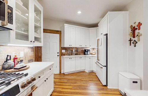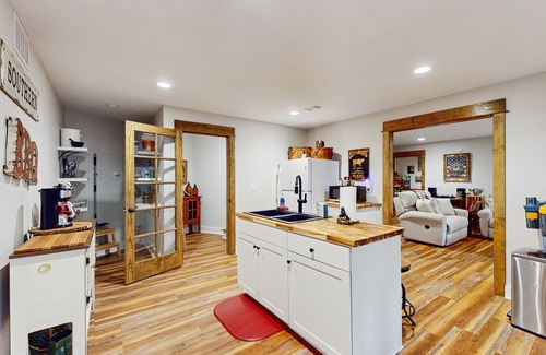 Inside, you’ll find a welcoming blend of rustic elegance and modern convenience. The open-concept living area features a comfortable seating arrangement and a large TV—perfect for movie nights or catching the big game. Challenge your family to a friendly match on the foosball table, or whip up a homemade meal in the fully equipped kitchen, complete with a stove, dishwasher, coffee maker, and all the essentials.