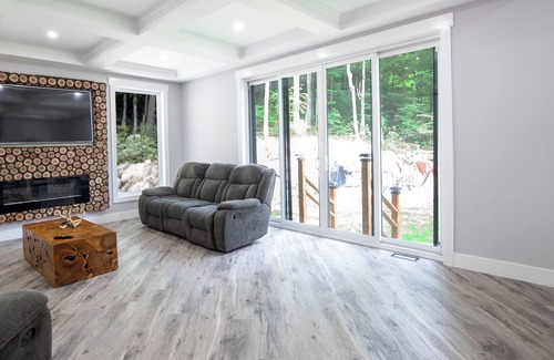 The Great Room really shows of the incredible ridge-line with large windows and slider. Enjoy the fire-log wall and fireplace while being entertained by the large wall-mount TV.
