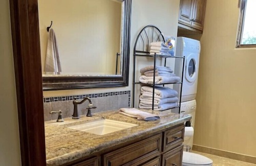 Large bathroom with walk in shower and stocked with plenty of towels. Beach towels provided for pool activities. Washer and dryer located in bathroom as well.