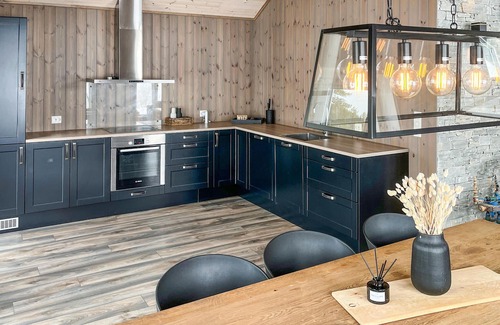 Situated on a small plateau, your vacation home welcomes you, combining modern elements with a cozy atmosphere for a vacation full of peace and community. The spacious kitchen becomes the natural meeting point in the house when you prepare your meals together and chat animatedly about your vacation experiences. The beautiful dining area invites you to enjoy long, convivial meals. Make yourself comfortable in the living area on the comfy sofas and seating, while nature awaits you outside. For cozy evenings, you can watch a good movie or read an exciting book and relax together.