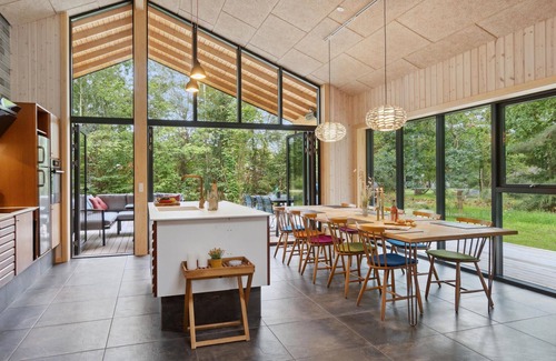 Relax in this beautiful vacation home and enjoy peaceful and relaxing vacations in this family-friendly house. As soon as you enter, you will feel at home here and appreciate the stylish rooms. Design and coziness create the perfect living experience here, which can be savored while cooking together or relaxing on the sofa. Entertainment is also guaranteed with games or billiards. If you like it quieter, you can reward yourself with wellness, as a Finnish wooden bath and a sauna hut await you in the garden. Also enjoy sociable evenings on the large terrace, which is optimally connected with the large living room through the large panoramic window.