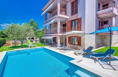 This holiday home is located in the small coastal town of Jadranovo, on the Crikvenica Riviera, and consists of a summer kitchen on the ground floor, four bedrooms and a room with kitchen, dining and living area on the upper floor. Each room has its own bathroom. The top floor is closed and unused. For your relaxation and refreshment, the property also has a pool and a barbecue where you can prepare delicious meals. The nearest beach is just a few minutes' walk away or you can drive to the sandy beach in Crikvenica. The island of Krk is also nearby, so we would definitely recommend day trips to the island towns of Baka, Malinska or Vrbnik.