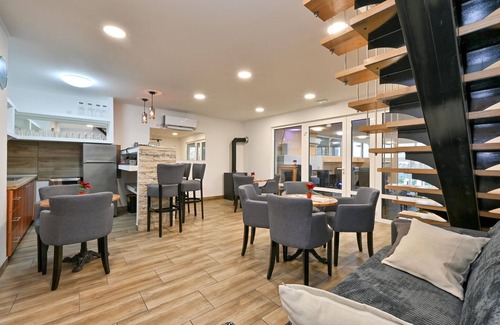 This modern holiday home offers you everything you need for an unforgettable holiday: invitingly designed, with an outdoor pool and an indoor spa area that promises pure relaxation with a whirlpool and Finnish sauna. The spacious room on the ground floor invites you to socialise in the evenings and is even suitable for special celebrations. The bedrooms on the ground floor are interconnected and offer separate access. Enjoy the marvellous view of the town of Koprivnica and the gentle, green landscape from the terrace.