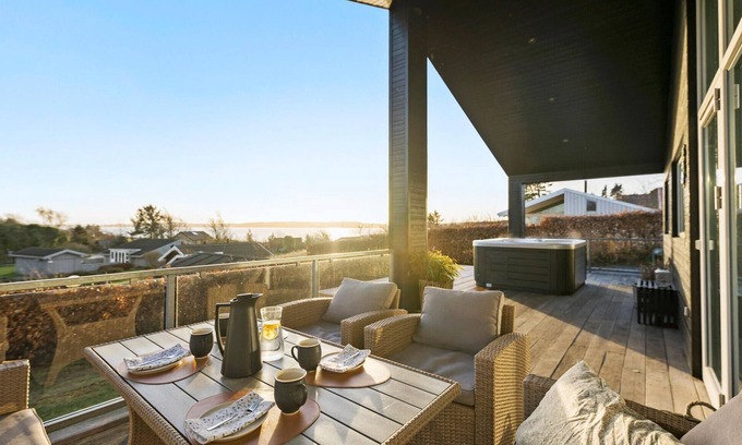 Enjoy the day on the spacious terrace, which is equipped with cosy lounge furniture and a hot tub, ideal for taking in the view of the picturesque landscape and the water. Go for walks in the neighbourhood or discover the surrounding sights. Nibe and Aalborg are only a short drive away.