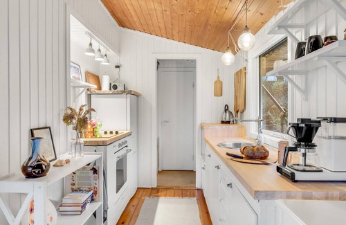 Welcome to this compact and super well furnished vacation home in Ølsted Strand. Every square meter has been used to provide you with an ideal retreat where you can relax and escape the worries of everyday life. Enjoy time with your family or friends, play board games and enjoy the warmth of the wood stove or watch an exciting movie. In addition to the bedrooms in the main house, you will find more sleeping options in the outbuilding. Between the two buildings, the cozy covered terrace invites you to spend a lot of time outdoors. Here you are protected from wind and weather and can sit outside until late in the evening. Enjoy your morning coffee on the beautiful wooden terrace that surrounds the house, while your children play and romp in the garden with swing and sandbox. End your days with a cozy evening by the fire in the garden.