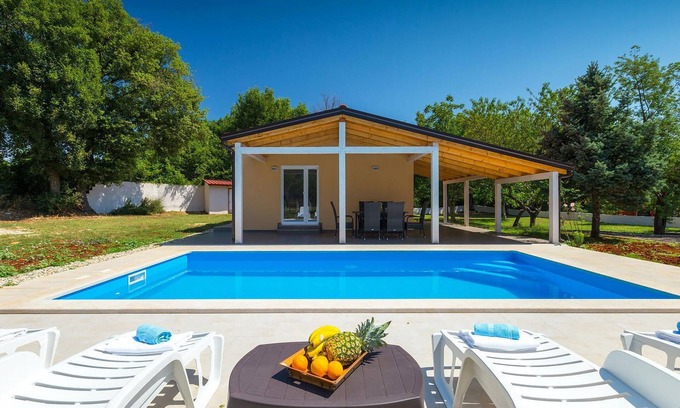 Villa Nezakcij is a cute little villa near Pula that offers the perfect accommodation for smaller groups. The villa has 3 beautifully decorated bedrooms and can accommodate up to 5+1 people in total. The villa consists of an open plan living room with a modern and well-equipped kitchen and dining area. Two of the three bedrooms have a double bed and an en-suite bathroom, while the third has a single bed and a separate bathroom. The outdoor area is the highlight of Villa Nezakcij. In front of the villa is a large private pool, which invites you to take a refreshing dip, or you can relax on the comfortable sun loungers while reading your favorite book. The villa is fully fenced and has a large lawn area where your children can let off steam. Just a few steps away from the villa is a charcoal barbecue where you can prepare delicious meals and serve them to your family in the covered outdoor dining area. The villa is ideal for families looking for a relaxing vacation surrounded by nature, and the picturesque little village of Valtura is known for its rich cultural and historical heritage dating back to Roman times. The most important archaeological site, Nezakcij, is located only 2 km from Valtura and is a popular destination for archaeologists. It is an ideal place for nature lovers, as well as for those who want to relax away from the hustle and bustle of everyday life,
