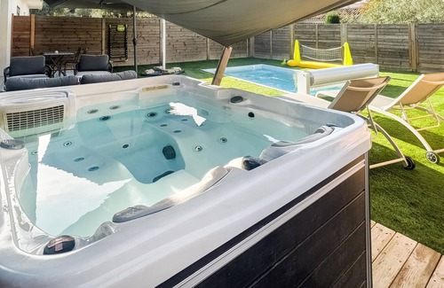 This holiday home with pool and whirlpool combines stylish design and comfort.