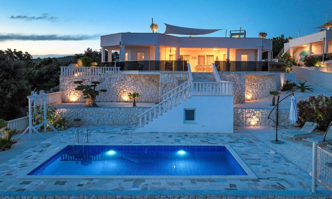 You will enjoy a luxurious interior with modern furniture and great design that is second to none. The house is in a secluded location with panoramic views of the sea and is well equipped: you can call a large garden, pool, outdoor fireplace, terrace with fitness equipment and whirlpool and much more your own. A pet is also allowed, so the whole family can come.