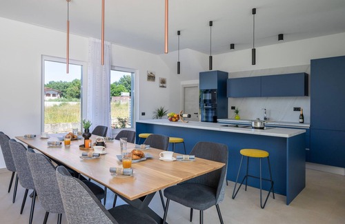 This modern and luxurious holiday villa offers you a spacious living area with a large, cosy sofa and a fully equipped kitchen to prepare your meals together. Have breakfast in peace and quiet, either at the elegant indoor dining table or use the stylish outdoor area for cosy meals al fresco.