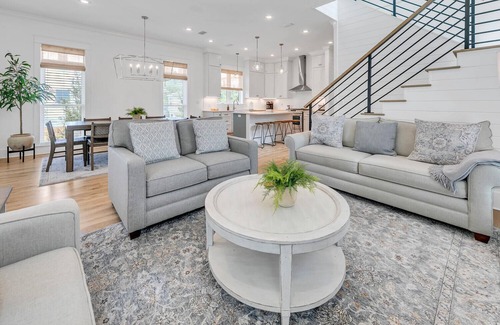 Hightide on Hiker is a luxury 2,100 sq. ft. home built in 2022 in the Greenway Park Community near Seagrove Beach, right off Highway 30A. This custom-designed, 4-bedroom, 3.5-bath home features gorgeous furnishings, vaulted ceilings, shiplap walls, and modern décor. Guests are welcomed by a charming front porch and a second-story balcony, both ideal for enjoying Florida's sunset skies. Inside, you'll find two spacious king suites (one on each floor), a bunkroom with two twin bunkbeds, and an additional guest bedroom with two twin beds, providing plenty of space for family and friends.