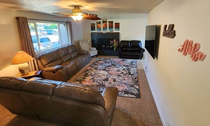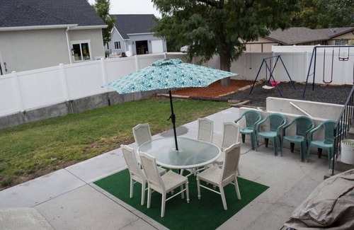 Amazing Hawaiian themed house for family reunions, corporate events, sports or competition groups, etc. Enjoy 9 bedrooms, 4.5 bathrooms, 2 kitchens, 2 dining rooms, recreation/workout room (ping pong, treadmill, elliptical, stair stepper), 2 laundry rooms, living room, movie room, backyard playground, barbecue area and fire pit. Huge selection of games, puzzles, and toys for kids and adults, plus Pac-Man video arcade. Access to private pickleball and basketball court with lighting for evening play is included. Off-street free parking for 10 cars in a quiet SW Orem, UT neighborhood. Walking distance to Utah Valley University and 15 minute drive to BYU. 25 minute drive to Sundance Ski Resort. Huge variety of dining and shopping venues nearby.