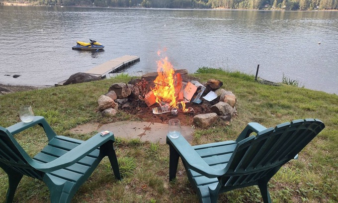 Whether it's morning coffee or an evening drink, enjoy the beautiful view from the covered porch, 100ft. of lake front with dock for swimming and fishing. Make memories sitting around and enjoying the lakefront fire pit.
