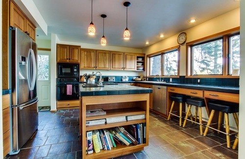 Whether you're gazing across the lake from the spacious deck at the mountains, or looking down from the second floor at the palatial living area of this and elegant Hayden Lake vacation rental home, the view is awesome inside and out! Located right on the shore of coveted and exclusive Hayden Lake, this four-bedroom, tri-level jewel has everything you'd expect, including a private dock, two fireplaces, and central air. Bright and modern, the design of this luxurious living area offers plenty of places for your group to sit and visit, as well as private nooks where you can escape with a book, or work on the laptop with the free WiFi. Come mealtime, bring your appetite and your cooking skills to this gorgeous, fully equipped kitchen that's ready for any culinary task! Six of you can sit down for your meal at the dining table, and three more can belly up to the counter on the padded stools. Hayden Lake may not be the biggest lake in Idaho, but its shoreline is some of the most coveted real estate in the region. You'll see why when you experience the comfort and luxury of this beautiful home right on its banks!
