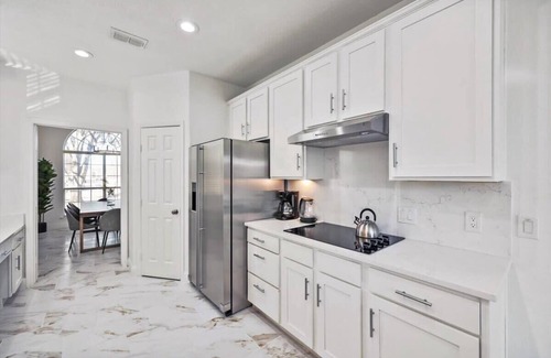 Enjoy the epitome of Texas living! This 6-bedroom, 3-bathroom mansion is located in the upscale neighborhood of Creekside Estates. Spacious and luxurious, this is the perfect Plano home. With a fully equipped kitchen, high-end finishes, and plenty of space for your family and friends, what are you waiting for? Book soon – we fill up quickly!