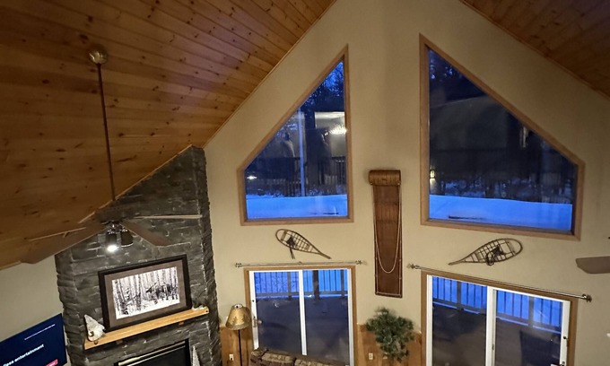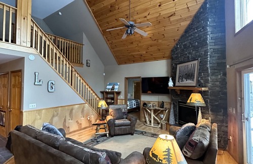 Welcome to Bear Paw Lookout! Bring the whole family to this spectacular home in Lake George. It offers a spacious living room with huge windows, large gas fireplace, wrap around porch, new hot tub and great entertaining area with bar!