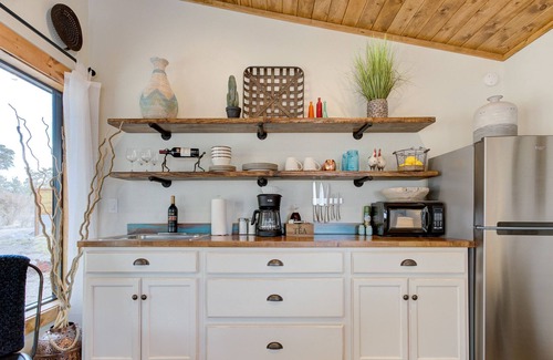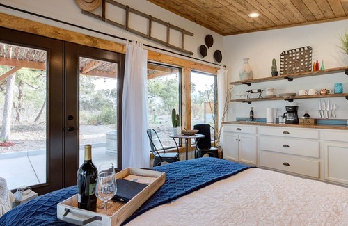 At Twisted Horns Ridge, we take pride in creating a peaceful escape and have carefully prepared our home for your stay. Although the Hill Country Casita is a tiny home, it is designed to feel much larger - with vaulted ceilings and large six-foot-tall windows along two walls that bring the outdoors in with views of the quaint porch and tree-covered yard.