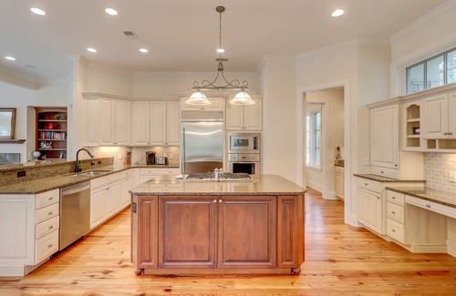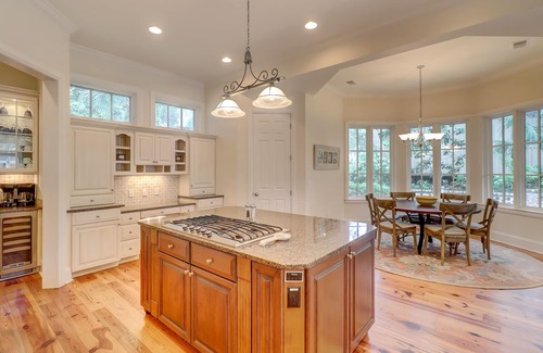 The kitchen is fully equipped with stainless steel appliances, granite countertops, a large kitchen island, and a private pantry. The formal dining room can seat up to eight. The breakfast table and bar top offer additional options for seating. There is also a standalone ice maker & mini-bar with a wine fridge and sink. A second full sized refrigerator is located in the garage.