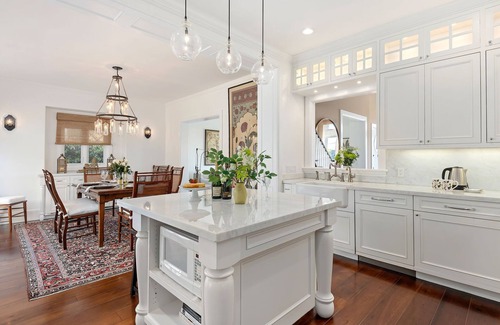 Inside, this bright and spacious home features cathedral ceilings and open concept spaces for cooking and dining. The recently remodeled kitchen is a chef's dream with stainless steel appliances, marble countertops, and a large island for food preparation. The owner is a chef and appreciates the well thought out cook's kitchen, making this a dream come true for other chefs. If you prefer to keep it simple, enjoy the al fresco dining area with a gas BBQ, perfect for a simple summer dinner. Dining at home offers plenty of options with the indoor dining table for six, or outdoor options in the sunken garden or an intimate setting on the deck overlooking the ocean.