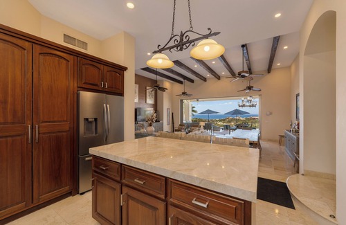 In addition to the two master suites, this rental boasts two private casitas with en suite, and another bedroom suite with a private bath. Other amenities include an open floorplan, infinity-edge swimming pool that can be heated, hot tub/spa with palapa enclosure, a large, upgraded kitchen with all appliances, extended, glass-panel accordion doors for those amazing views and indoor/outdoor feel, and a fiesta-ready, Sonos speaker system.