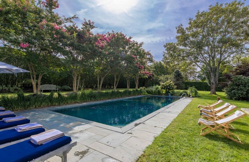 Revel in the luxury of the Hamptons in this impressive architect-designed estate. Located south of the highway on Sagg Main Street in the heart of historic Sagaponack, the spacious House Behind the Hedges is perfect for a big family gathering. Its minutes from the Atlantic beaches and the shops and restaurants of Sagaponack.