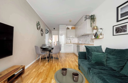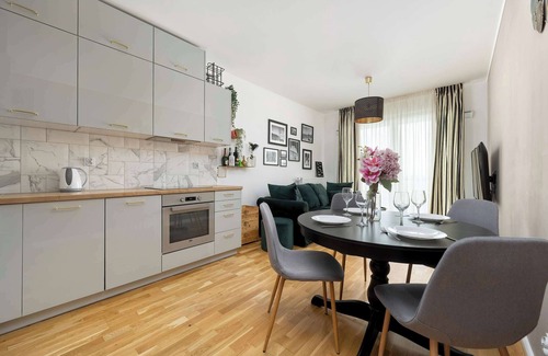 This spacious 55.54 m2 apartment has been designed for maximum comfort for 4 guests. It is ideal for parents with children, groups of friends, or business travelers. At the heart of the apartment is an elegant living room that invites you to spend time together. A large television with satellite channels and Smart TV functionality guarantees evening entertainment and relaxation after an eventful day. The room opens onto a large, furnished balcony where you can enjoy your morning coffee, admire the views, and enjoy the fresh air. The apartment has two separate bedrooms that offer peace and privacy. The first one has a comfortable double bed (160 cm) and a spacious wardrobe, while the second one has a double sofa bed and a desk for comfortable remote work. In each bedroom, the space has been arranged to ensure maximum functionality. The fully equipped kitchenette encourages guests to prepare their own meals. Guests have access to an induction hob, oven, refrigerator with freezer, and electric kettle. The dining table is a great place for shared meals and conversations. Modern appliances such as a dishwasher make it easier to keep things tidy. The modern bathroom features a shower, washing machine, and hair dryer, making longer stays even more comfortable.