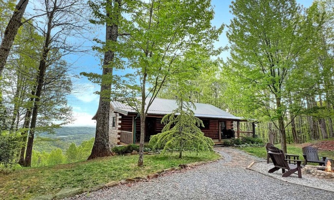 Mountaintop cabin with fire pit, covered porches, long range views near Stone Mountain State Park, Roaring River Vineyards, and easy drive to the Blue Ridge Parkway. Located in a gated community in Wilkes County, Grais cabin sits on 10 wooded acres and is tucked away at the top of Carter Mountain, offering long range mountain views with outstanding vistas; perfect for enjoying your morning coffee or watching the sunset! 4WD or AWD required.