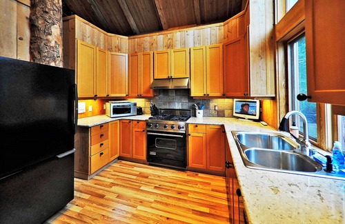 very PRIVATE 20-acre gated estate in the woods on Mt. Dallas. Hot Tub for 7, private filtered Lake for swimming, all King beds, memory foam mattresses, and SHEEX (the most supple sheets ever!) 65" FLAT SCREEN and 7 more in BR's. 3 baths, Large LR, dining table for 10+, piano, game room, pool table, ping pong, 2 wood stoves, washer/dryer, breakfast table, gourmet kitchen & kitchenette. Huge 2-story home, 30 ft soaring beamed ceilings. Elevated deck, gas BBQ and dining looks out at Mountains and water!