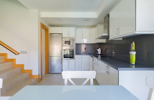 The interior of this Salobre Golf Villa Premium is completed with a bright and modern living room and dining room adjoining the kitchen, which is fully equipped.