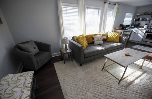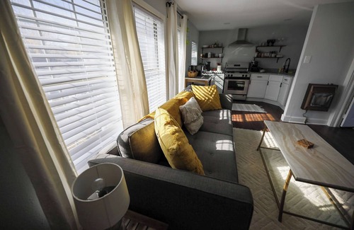 This beautifully designed loft is perfect for a relaxing stay. With high ceilings, natural light pouring through large windows, and rustic yet stylish furnishings, you'll feel cozy and inspired the moment you walk in. The spacious living area is complete with comfortable seating, a smart TV for your entertainment, and thoughtful touches like plush throws and artwork to make you feel at ease.