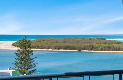 The unit has 2 bedrooms and is located on the 7th floor with lift access, and offers amazing views of the Pumicestone Passage, shipping lanes, and Bribie Island, and also overlooks the heated lagoon style pool. The unit includes ducted air-conditioning, a good sized balcony, full kitchen & laundry facilities and comfortable furnishings. The bedding configuration is a Queen and 2 Single beds.