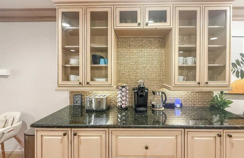 • Keurig with complimentary pods, kettle, double-door fridge, dishwasher