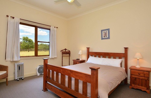 The lounge room contains a log fire and TV/DVD where you can spend relaxing evenings. The main bedroom contains a four-poster Queen sized bed, ensuite and French doors opening onto the verandah. Bedrooms 2 & 3 have queen-sized beds and face north. Bedroom 4 also has a queen-sized bed and French doors that open onto the verandah.