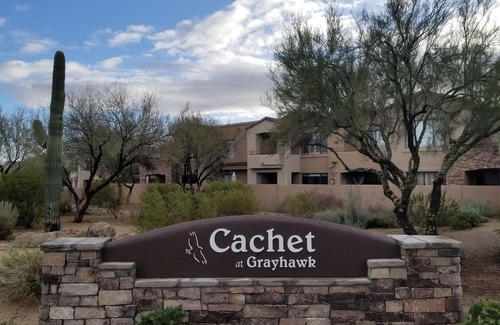 Newly remodeled, private, guard gated Grayhawk community condo in the heart of North Scottsdale. The spacious layout in this condo includes all new flooring, paint, black stainless appliances, all new furniture throughout including new TV's, Hi-speed internet/wifi bedding/linens, new countertops and all your kitchen necessities you'd find at home, fireplace, two balconies (one off dining room and one off the master suite). Your master suite is on the opposite end of your other rooms for great privacy with 5 piece bathroom and walk in closest, 3rd room doubles as an office/bedroom with easy pull out trundle bed, inside laundry room, whole house water softener/filtration, 2-car attached garage with interior entry into home, walking trails throughout the Grayhawk community, resort style pool with two jacuzzi's and beautiful clubhouse including a gym, awesome sunsets and pool views!