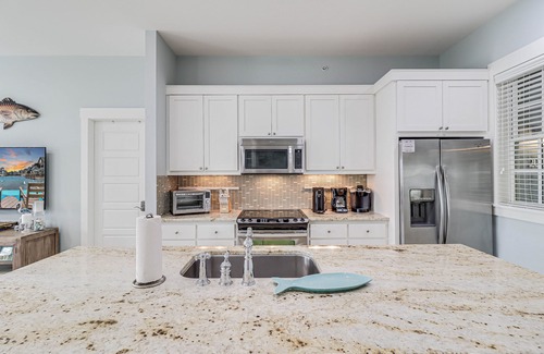 MAIN LIVING SPACE: A large sectional sofa facing a wall-mounted TV anchors the main living area, which flows back to the dining area and kitchen. A round table seats up to six, and there’s bar-stool seating at the kitchen island. Stainless appliances and every gadget you’ll need make meal prep easy, and the kitchen offers bonus storage and built-in nooks for beach gear during your stay.