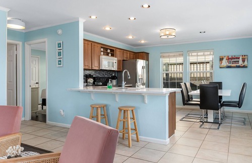 Right next door to the Golf Cart Rental and the Beach, This home has a large open comfortable family room area to sit and visit or watch TV. It has two sofas, two arm chairs and is open to the kitchen which has bar seating and a dining table. The three bedrooms and two baths are perfect for a family weekend or week long stay, plus a pull out queen bed sofa sleeper for the extra sleeping room if you need it!