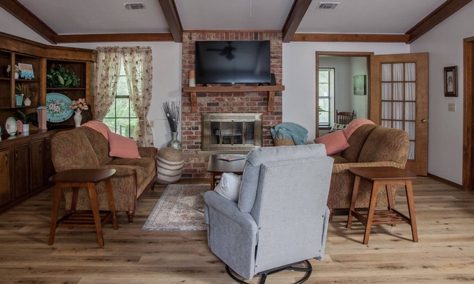 The Retro on Rustwood is a beautiful and well equipped 2 bedroom, 2 bathroom house in Lufkin. The home is fully furnished and has a 2 car garage with auto door opener. Although the floors have been updated with vinyl plank flooring, there is still plenty of mid century charm in this home to enjoy. In the Master bedroom, you will find a King bed, smart TV, ensuite bathroom, separate vanity area and walk-in closet. The second bedroom has a Queen bed and also boasts an ensuite bathroom. Amenities included: essentials (kitchenware, bathware, linens), Smart TV in LR and Master BR, smoke and carbon monoxide detector, fire extinguishers, washer and dryer, iron and ironing board, non-smoking and no pets in a nice, quiet, small subdivision only half mile from the city loop. The home is about 1.5 mi to Woodland Heights Hospital and 2 mi to CHI St Luke's Hospital and very close to grocery stores, shops and restaurants. All utilities are included.