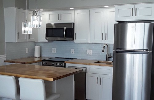 The living room has a 65" flat panel TV, which sits on the new credenza. wainscoting, in the hallway and living room. We have just added a coffee bar and a new island with stylish white bar stools. All done in soothing coastal colors.