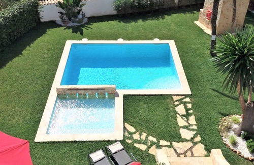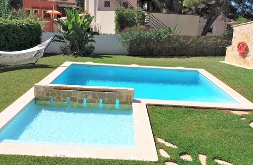 This renovated holiday villa is located in the popular seaside resort of Paguera, in the south-west of the island of Mallorca, just a 3-minute walk from the fine, gently sloping sandy beach. Despite its proximity to the shops, the generously designed house is very quiet in the countryside and offers space for up to 12 people.XXL, beachfront holiday villa with pool and garden, 4 terraces, comfortably furnished, suitable for up to 12 people,
