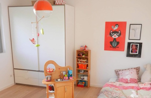 There you will find 3 bedrooms that can be used as children's rooms. In addition there are 2 bathrooms. One with toilet and shower, another luxurious one with bathtub, toilet and rain shower. A dressing room provides enough storage space. 2 bedrooms on this floor are included in the basic price. Another room can optionally be rented.