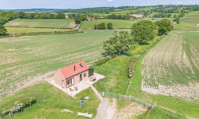 Amid a landscape of fertile farmland, this repurposed rural abode adds a chic twist to traditional country living. Step inside and enjoy the large windows with enticing glimpses of the fields beyond, while a modern wood burner brings a warm after-dark glow to the open-plan living space. Curl up on the sofa for an evening in front of the Smart TV, cook up a romantic meal for two in the bold-coloured kitchen and enjoy quality time together as you sit at the cottage-style dining suite. A stylish shower room with walk in shower, a pair of basins and an exposed brick wall completes the convenience of the ground floor layout. A wooden staircase repurposed from an old granary, leads from the centre of the living room to a dreamy mezzanine-level king-size bedroom, where a perfectly positioned window frames the far-reaching view.