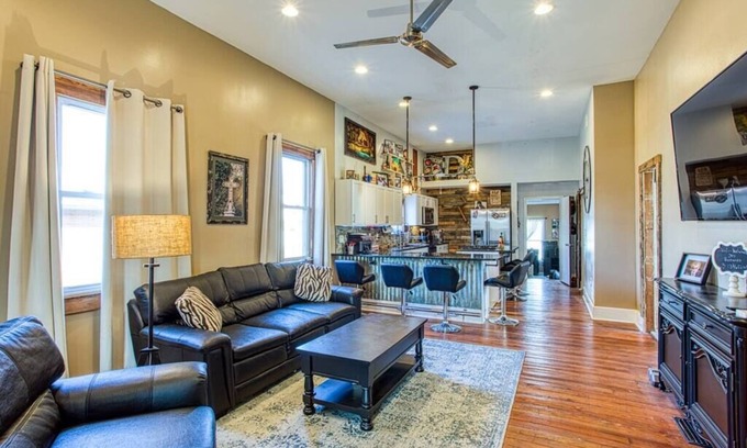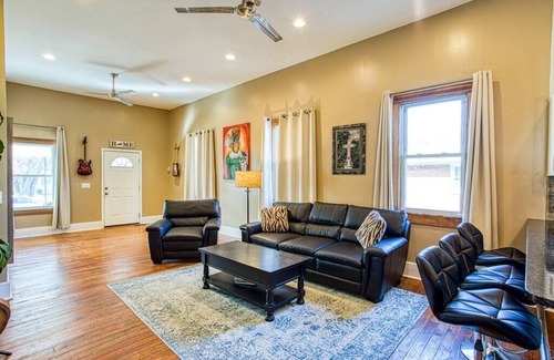 5 Min's to Churchill Downs, 5 Min to Louder than Life, sleeps 8-12 people, hardwood floors, great for entertaining the family or friends, open floor plan, modern amenities, 75" flatscreen, 12 ft. ceilings, granite countertops, leather couch, stainless steel appliances, gas stove, dishes, pots & pans, 5-6 cars/RV parking, wine & bourbon glasses, bowls, silverware, HUGE backyard-BBQ Grill. I do have a private office in the back with a completely separate entrance that I'm not in very often.