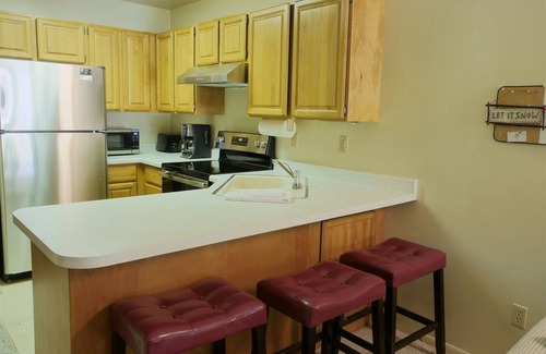 This beautifully decorated Wolf Lodge condo #1211 has vaulted ceilings in the living area. It has 2 bedroom and 2 baths. The large living area has an entertainment area, with a large flat screen TV and a large dinning space. The kitchen has new tile flooring and is fully stocked with everything you need to cook and serve. You will find a main floor bedroom with a king bed that offers a flat screen TV and an outside deck overlooking the Valley and Nordic Valley Ski Resort, a very pretty view especially when Nordic Valley have night skiing lights on. The second bedroom is upstairs with a queen bed and a new flat screen TV and has an open floor plan with an open hallway to the loft area. The upstairs area also offers a loft area that includes a trundle bed (2 twin beds), a full bath. There is a small washer/dryer in the condo which is special for Wolf Lodge!