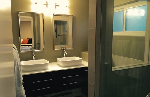1964 mid century ranch home with small pool and large spa. 2 separate wings make this the perfect home for a multi family vacation or a group of up to 8 people. 2 bedrooms (1 King and 1 Queen) and 2 baths on one side of the house and 1 bedroom (2 Queens) and 1 bath on the other side with pool access. Comfortable family room with 55" LCD TV and cozy living room with dining table, original gas fireplace and bar. Large fully equipped kitchen makes this home perfect for relaxing with family and friends. All bedrooms have outside access and the front bedroom has it's own large patio with gated entrance. Location Location!! Walk out the front door and in 5-7 minutes be at Casa Mendoza, Arnold Palmers, Lavender Bistro, or many other great restaurants, bars, art galleries and shopping. Stroll down in the morning to La Quinta Coffee Co. through Civic Center Park, home of the La Quinta Arts Festival. You could just park your car and walk or bike everywhere. If you decide to drive somewhere, you can get to numerous destinations within 5-10 minutes. Silver Rock golf course is 5 minutes away as are the La Quinta Mountain and Dunes courses. Coachella and Stage Coach music festivals are a 10 drive right down Ave 50 or 52! If you are into hiking or mountain biking you can go up to the top of the Cove and choose from several great trails. The Indian Wells Tennis Stadium is about a 10 minute drive.