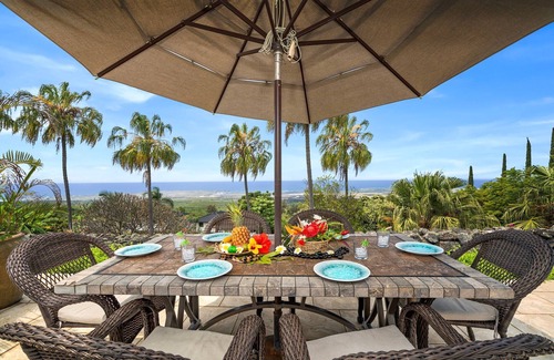 Perched at a cool 1,000-foot elevation on the slopes of Hualalai, Kona Heavens is the perfect retreat for couples, families, and friends traveling together. This spacious island home invites you to relax on the lanai, grill dinner as the sun dips into the Pacific, and enjoy unforgettable Hawaiian sunsets night after night. With a saltwater pool, lush tropical landscaping, and panoramic ocean views, it's an ideal setting for making lasting memories in paradise.