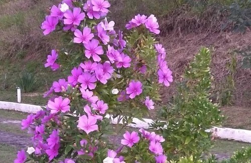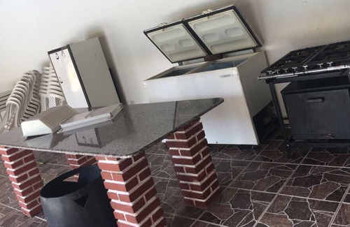 House with kitchen (2 refrigerators and 2 stoves and 1 microwave), service area, balcony, living room (1 ground and 1 upper), 2 ground floor bathrooms, 1 upper half bathroom, total of 10 bedrooms (sleeps 60 comfortably) and besides a large grassy area with a beautiful landscape.