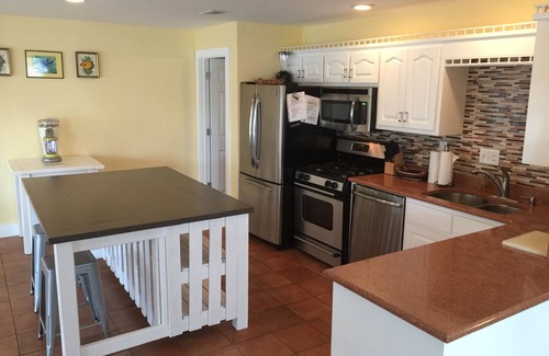 There is plenty of off street parking for multiple vehicles. If traveling with a boat or by RV we have room for that too. RV hookups available. Inside All Decked Out our guests will enjoy spacious open living areas. There is a sun porch that is great for that morning cup of coffee. The sun porch leads to the open kitchen and living room areas. The kitchen has been updated recently with new stainless steel appliances and quartz countertops. It is fully stocked with pots and pans, cutlery, dishes etc. to make any dinner preparation as easy as possible. There is central air conditioning along with ceiling fans in each room.