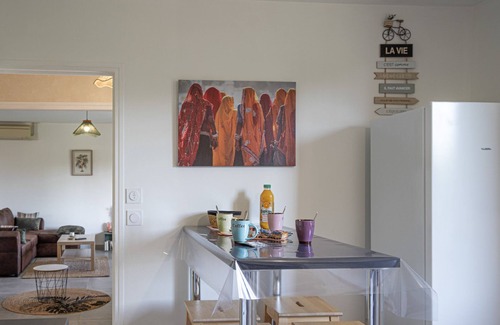 This spacious accommodation on the first floor of a detached house offers a large living area open to the lounge, which features a fireplace, and a beautiful, separate, fully equipped kitchen, ideal for convivial moments. It has 4 bedrooms with comfortable bedding: two bedrooms with 90 cm beds, two bedrooms with 140 cm beds, and two office spaces, one of which is within a bedroom. The terrace is private, and the garden is perfect for relaxing or engaging in activities; in season, you can enjoy picking apples and cherries. Close to Limoges, with access to the A20 in just 4 minutes, you can easily explore Limoges and its surroundings.
