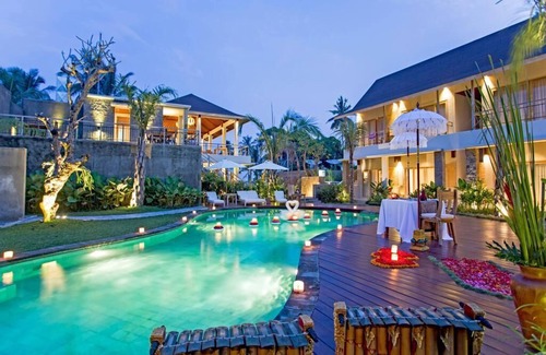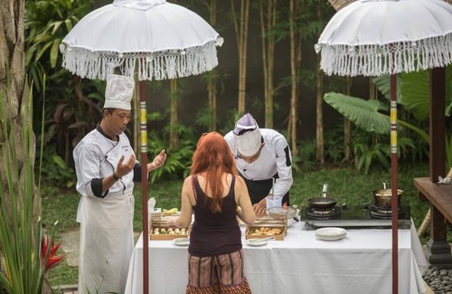 Greenery 3 (three) bedroom villa include breakfast has white-washed timber finishes and features an artistically designed Jacuzzi-edge private swimming pool surrounded by a wooden sundeck. There is also a dining pavilion and kitchen against a backdrop of tropical greenery. Each bedroom promises comfortable nights of restful slumber with two king and a twin bed fitted with quality cotton sheets & an overhead mosquito net. Offers complimentary scheduled shuttle service to or from Ubud Coco Mart.