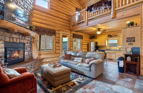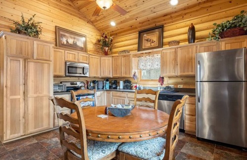 There is plenty of room for large groups and families in the Meadow View cabin. This spacious, two-story oasis has secured a dedicated high-speed fiber internet connection so you can stay connected and even work remotely if your visit requires. The cabin also features a gas grill and plenty of seating along the covered porch for a beautiful night under the stars.