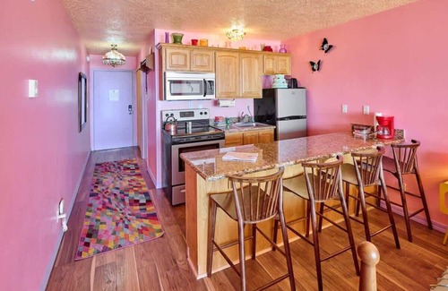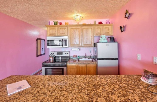 Welcome to the "Groovy Mermaid"! This beachfront studio on the third floor is a colorful oasis for up to 4 guests, with a king bed and two futons. Fully stocked kitchenette and full-sized bathroom ensure comfort. Enjoy our indoor heated saltwater pool and dry sauna. Dive into cosmic vibes and colorful fun, where every stay is a groovy journey back in time!